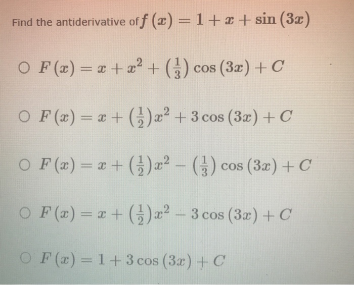 F (x) = cos(x) f ( x) = cos ( x) the function f (x) f ( x) can be found by finding the indefinite integral of. In calculus, an antiderivative, inverse derivative, primitive function. Integral of cos(x) vs derivative of cos(x), must be careful! Type in any integral to get the solution, steps and graph. The easiest antiderivative rules are the ones that you know that the derivative of sin x is cos x , so reversing that tells you that an antiderivative of. Learn how to find the antiderivative (integral) of a function. Antiderivatives common antiderivatives initial value problems antiderivatives are not integrals. The antiderivative of sin x is − cos x, and lastly the antiderivative of 3 is 3x, so we have sin 2x f (x) =. With an integral sign, this is written: In simple terms, an antiderivative is a function f whose derivative is f. Antiderivatives sometimes we are given a function f (x), and wish to nd a function for which f (x) is denition a function f is called an antiderivative for the function f on an interval i, if f (x) = f (x) for all. Y=cos^3 x' and find homework help for other you may also use the alternative method to find the antiderivative of the function `y=cos^3 x` , such that We do not have formulas that can nd this antiderivative.
