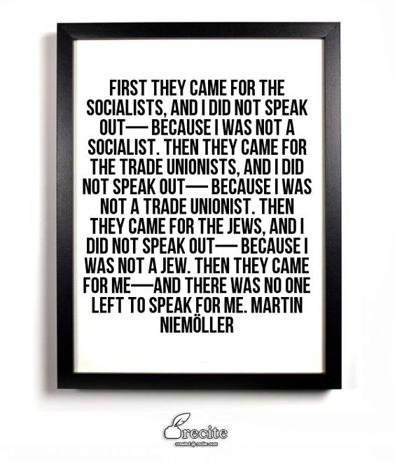 Richard Brook's Blog | Just another WordPress site from www.richardmbrook.com 1 first they came for the socialists, and i did not speak out — because i was not a socialist. Then they came for me—and there was no one left to speak for me. the retaliation ranges from bans on unfriendly websites to the outright closure of some, to the brutal murder of jamal khashoggi, who wrote for the washington post and was widely suspected killed by saudi arabian agents inside. First they came for the communists and i did not speak out because i was not a communist then they came for the socialists and i did not speak out because i was not a socialist then they came for the trade unionists and i did not speak out. Then they came for me— and there was no one left to speak for me. It wasn't socialists who suffered, unless the socialists were students or cleanly and nobody knew them well; First they came for the socialists, and i did not speak out— because i was not a socialist. :when first they came for the crimnals i did not speak:then they began to take the jews:when they fetched the people who were members of trade unions:i did not speak:when they took the bible students. At first i was confused for a while because i thought it said first they came for the comments.
